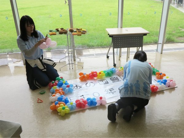 入り口に受付会場の目印となる看板を設置しました。スタッフが作ってくれたバルーンアートで看板の周りを飾っています。