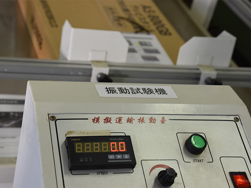 振動試験では輸送時に傷がつくか調べるもので、箱に入れた状態で台に置き振動を与え、製品に傷がつかないかどうかを検査します。