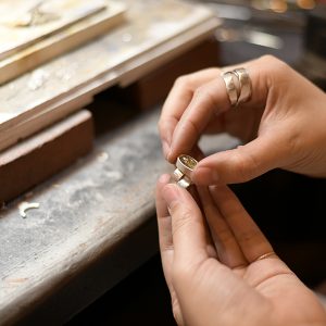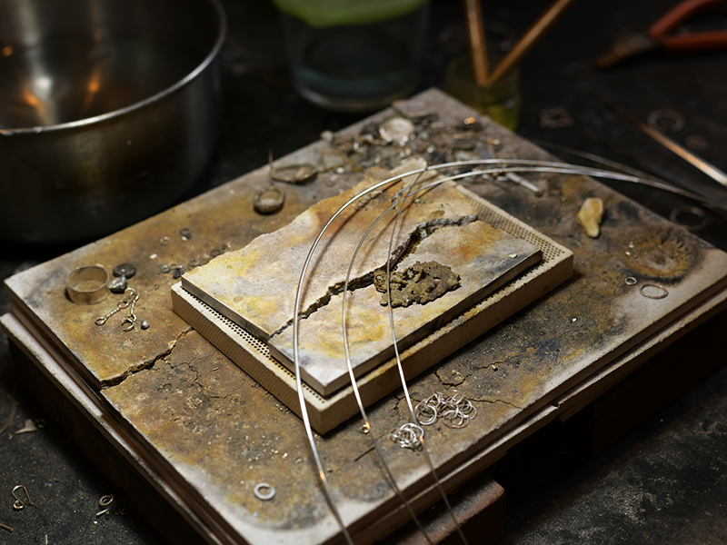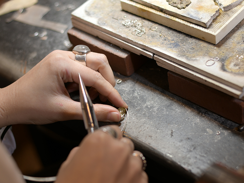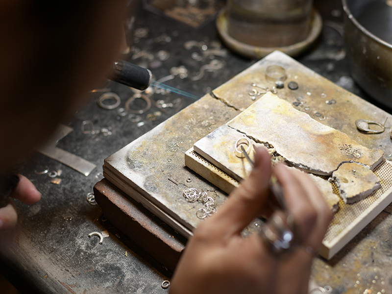 彼女の手掛けるジュエリーは全てが手作業で行われるため、溶かした金属などをあらかじめ作製しておいた鋳型に流し込み、それを冷やすことで固める鋳造とは違い、大量生産にはない、世界に一つだけしかないジュエリーができあがる。