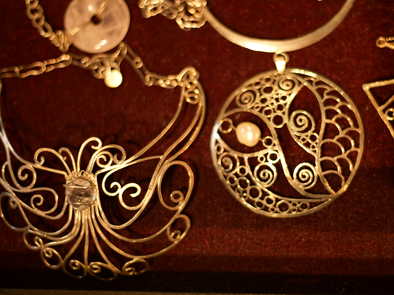 彼女はジュエリーの制作を手がけていた母から技術を習得し、この金属を自由自在に加工し、一つ一つをロウ付けし繋ぎ合わせ、繊細な模様を描く、透かしという表現方法を身に付けていった。