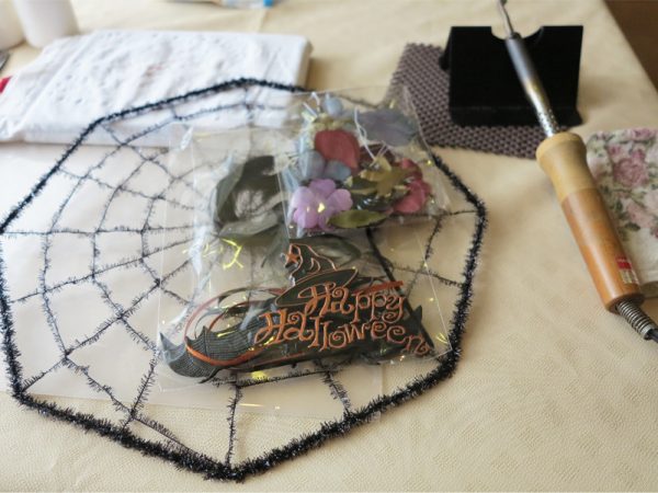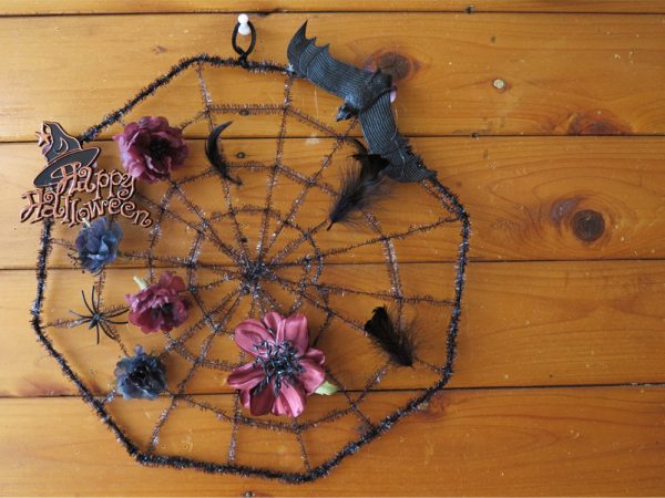 同じ作業を繰り返し、複数の布花を作成したら、蜘蛛の巣に取り付ける。すると、ハロウィンの季節にふさわしい作品が出来上がった。