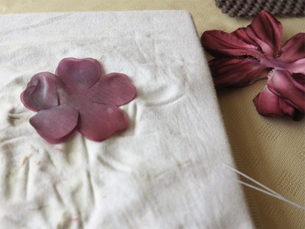 蜘蛛の巣に見立てた土台に布花が飾られるのだが、写真を見てわかるように、布花を作成する事から始まる。材料はこのように花びら状に形作られた布だ。このように真っ平な布からどのように花の立体感や躍動感を作り出すことが出来るのか不思議でしょうがない。