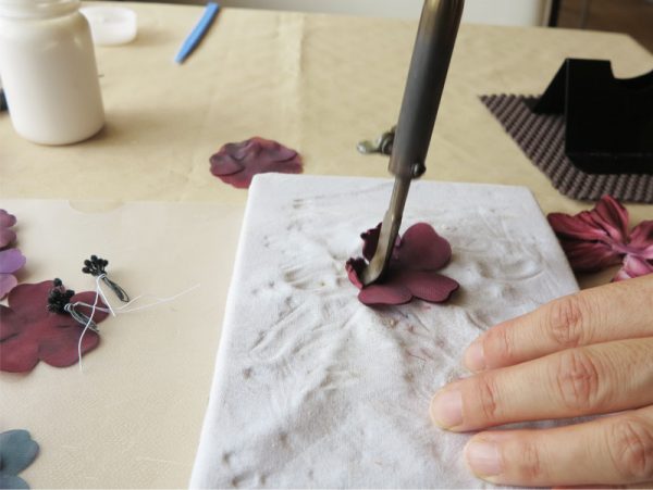 布花の形成には、このようにコテを使って行われる。先ほどの平らな布に熱したコテを当てることで、好みの形にアレンジする。