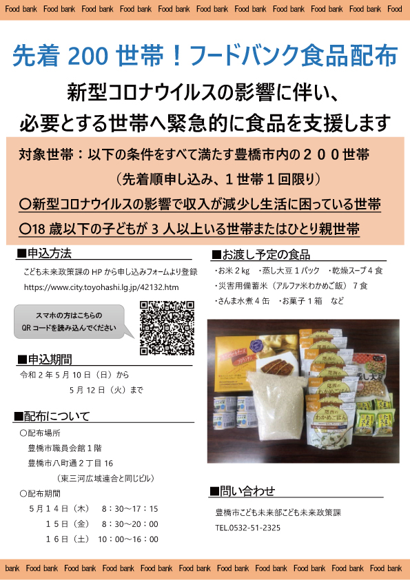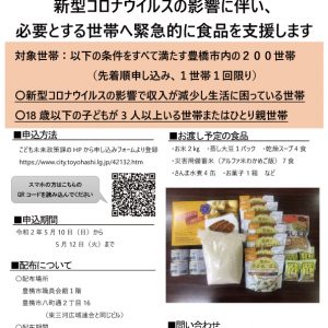 新型コロナウイルス感染症の影響を受け、収入が減少するなど日常生活に支障をきたしている世帯を緊急的に支援することを目的として、希望する世帯に食品を配布します。