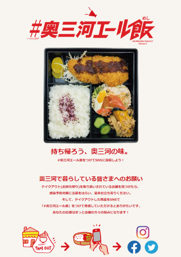 そして、テイクアウトした商品をSNSで「#奥三河エール飯」をつけて発信していただけるとありがたいです。