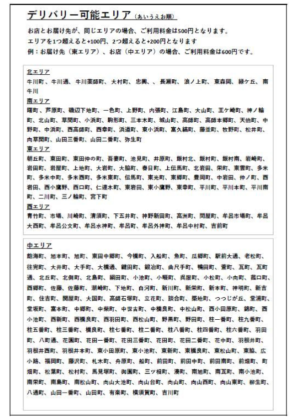 お料理の価格 + エリア内500円 ※エリアを超える毎に+100円