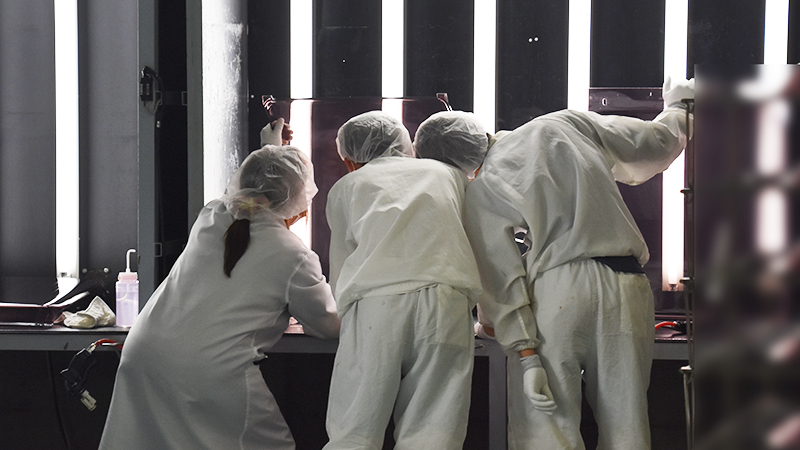 まずは前処理として、出来上がったポリカーボネート製品の表面につくゴミやホコリを取り除き、傷などが無いか徹底的にチェックする。