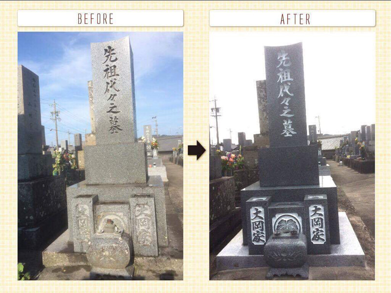 玄関周りやアプローチ、外塀、建造物、ベランダ床、駐車場などお家・お店などの外観のお手入れが行き届かずに、水アカ・カビ・コケ、またはサビ・シミ・エフロなどで汚れたままお過ごししていたり、お客様をお出迎えされてしまっていませんでしょうか?また、大切なご先祖様のお墓に関しても水アカ・カビ・コケなどで汚れていたり、文字が剥げてみっともないなどのお悩みはございませんでしょうか?高圧洗浄機での洗浄では汚れは以外にとれないものです。当店にお任せいただければ、建設・建墓のときのような眩しく輝く姿に蘇らせていただきます。他にはない洗浄技術をご体験していただければ、そこには感動が待っています。マスコミでも取り上げられているウソのない自信と経験で皆様の汚れで暗くなっている石材のお悩みを解決させていただきます。