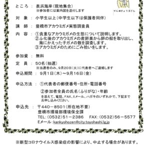 | 応募方法 | 2022年9月1日(木)~9月16日(金)までに (1)代表者の郵便番号、住所、電話番号 (2)参加者全員の氏名(ふりがな)、年齢 を添えて、電話、FAX、Eメール、ハガキのいずれかで、下記までお申し込みください。 〒440-8501(所在地不要) 豊橋市役所環境保全課 電話:(0532)51-2386 FAX:(0532)56-5577 Eメール:kankyohozen@city.toyohashi.lg.jp |