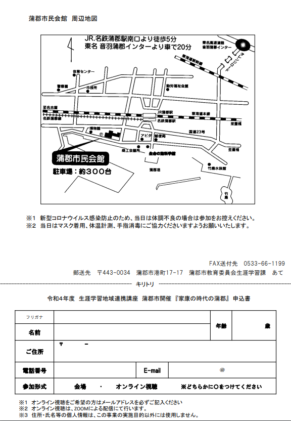 (3) 講座チラシの申込用紙を、郵送(〒443-0034 蒲郡市港町17-17)またはFAX(0533-66-1199)にて申し込み