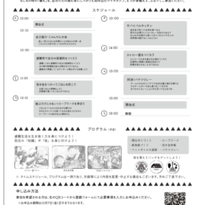 市内小学校に通う1年生から3年生の児童とその親を対象とし、親子で「大地震発生後の避難が必要な時期」を生き抜くための力を身に着ける内容です。本イベント通じて子供たちへの防災への興味・関心を高め、災害に備える心構え、災害時に生き抜く知恵などを身に着けていただけるよう、NPO法人プラス・アーツと共催で開催します。