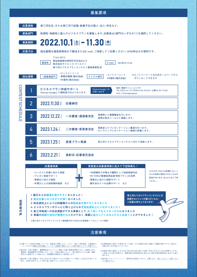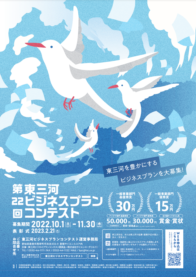 | 申込み問合せ先 | (株)サイエンス・クリエイト内 東三河ビジネスプランコンテスト運営事務局 〒441-8113 豊橋市西幸町字浜池333番地の9 TEL:0532-44-1111/FAX:0532-44-1122 E-mail:bpc@tsc.co.jp WEB申込みはコチラ |