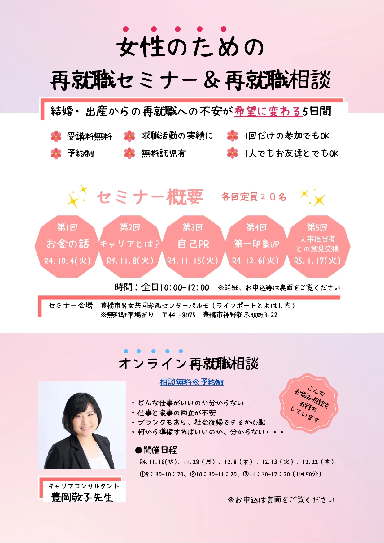 | 場所 | 男女共同参画センター「パルモ」(ライフポートとよはし内) (豊橋市神野ふ頭町3−22) |