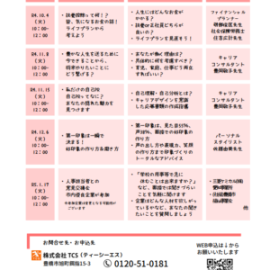 | 日時 | 2022年10月4日(火)、11月8日(火)、11月15日(火)、12月6日(火)、2023年1月17日(火) 時間:全日10:00~12:00 |