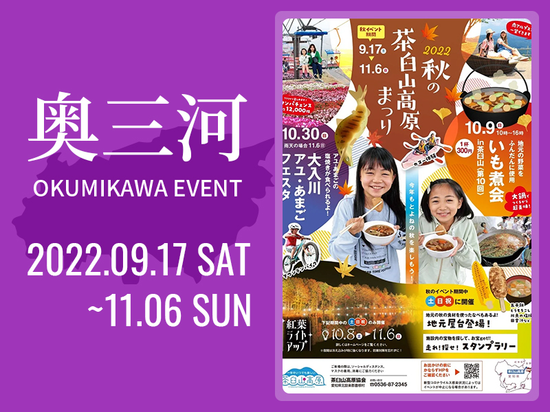 「いも煮会」をはじめ、露店販売など豊かな自然の中でおもいっきり楽しめるイベントを茶臼山で行います。また、紅葉は10月下旬から11月上旬で愛知県で一番早く紅葉が始まります。