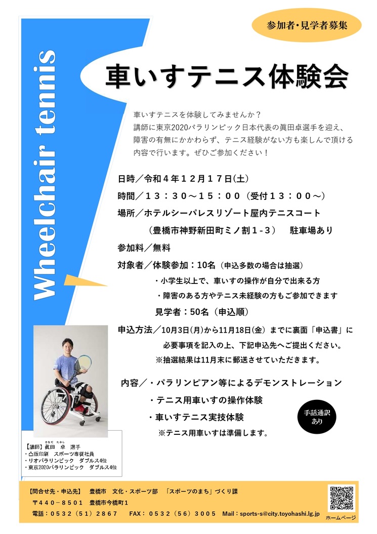 講師に東京2020パラリンピック日本代表の眞田卓選手を迎え、障害の有無にかかわらず、テニス経験がない方も楽しんで頂ける内容で行います。