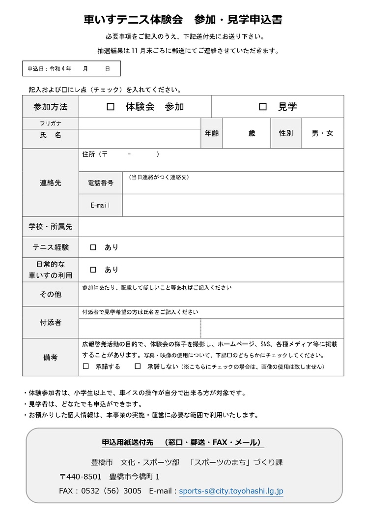 提出先:〒440-8501 豊橋市今橋町1番地 豊橋市文化・スポーツ部「スポーツのまち」づくり課(西館3階)