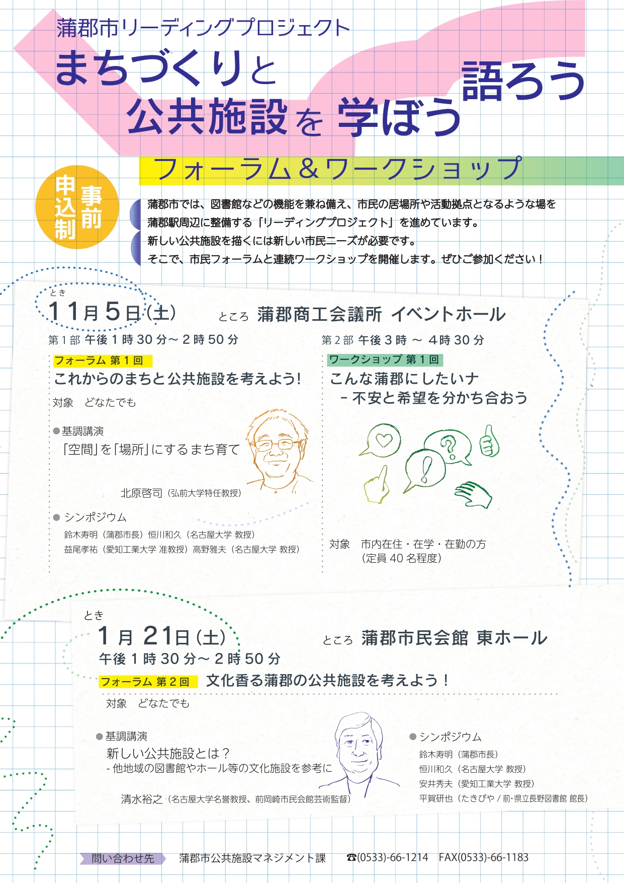 ファクス:住所・氏名・年齢・電話番号、「公共施設ワークショップ参加希望」と記載(送付先:FAX0533-66-1183)