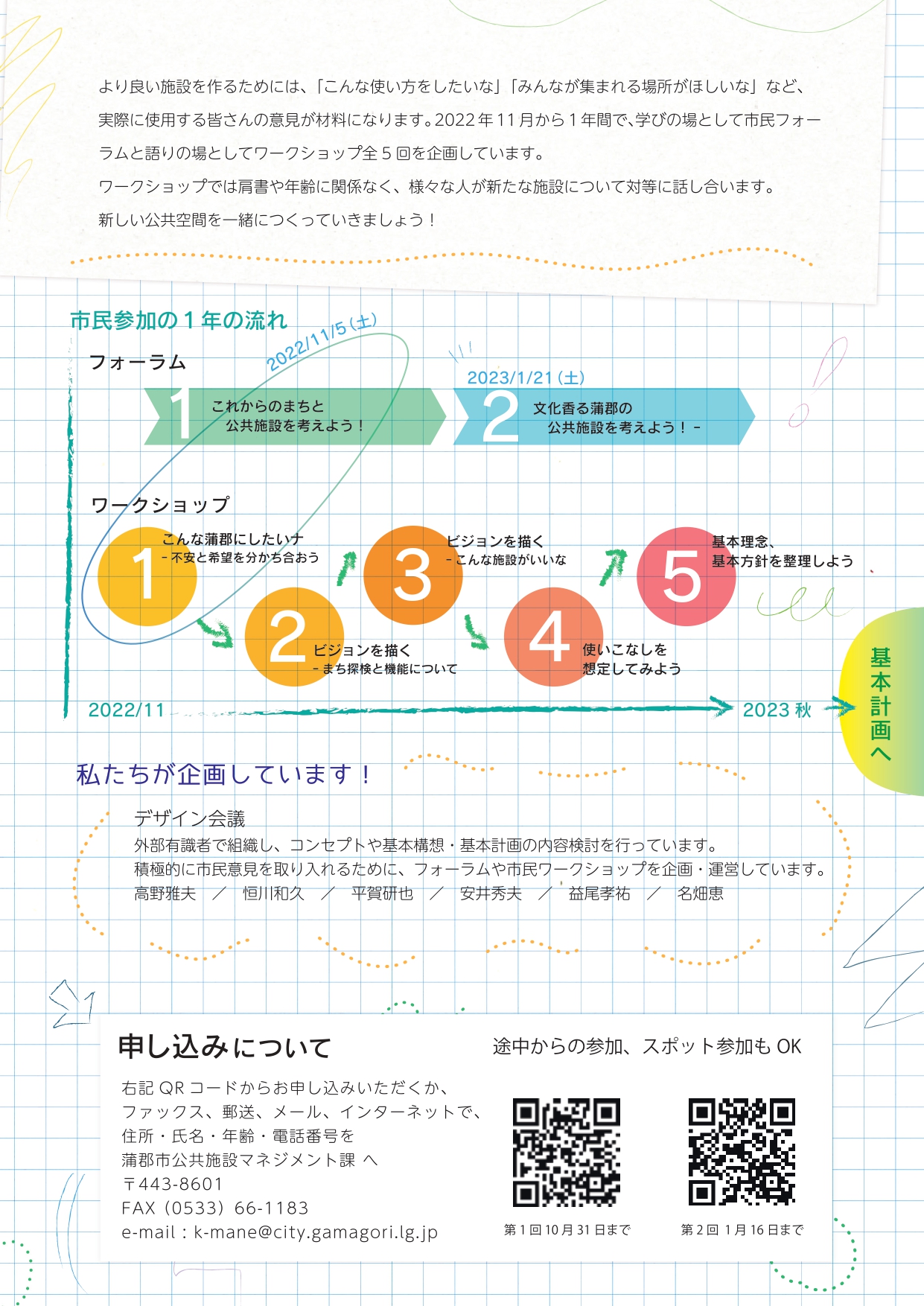 メール:住所・氏名・年齢・電話番号にタイトル「公共施設ワークショップ参加希望」と記載(送付先:k-mane@city.gamagori.lg.jp)