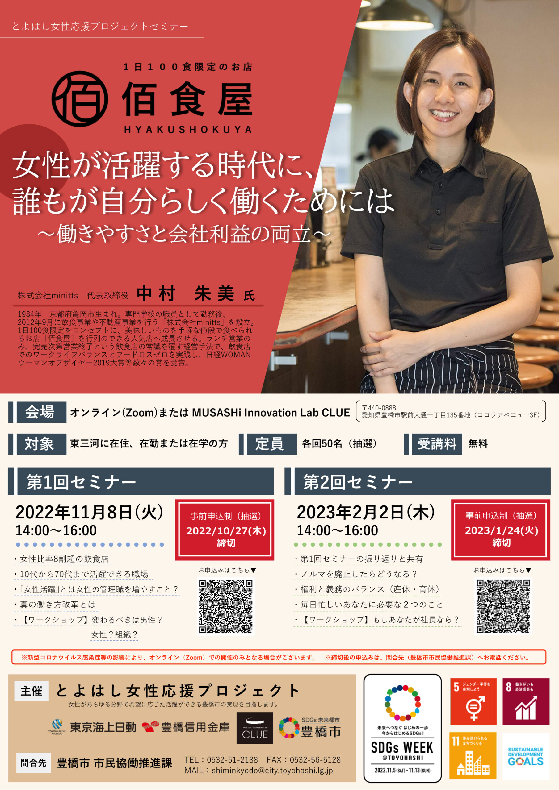 1日100食限定の飲食店「佰食屋」を展開する中村朱美さんから、女性活躍を促進する働き方改革と利益の両立につながる取組みを学びます。