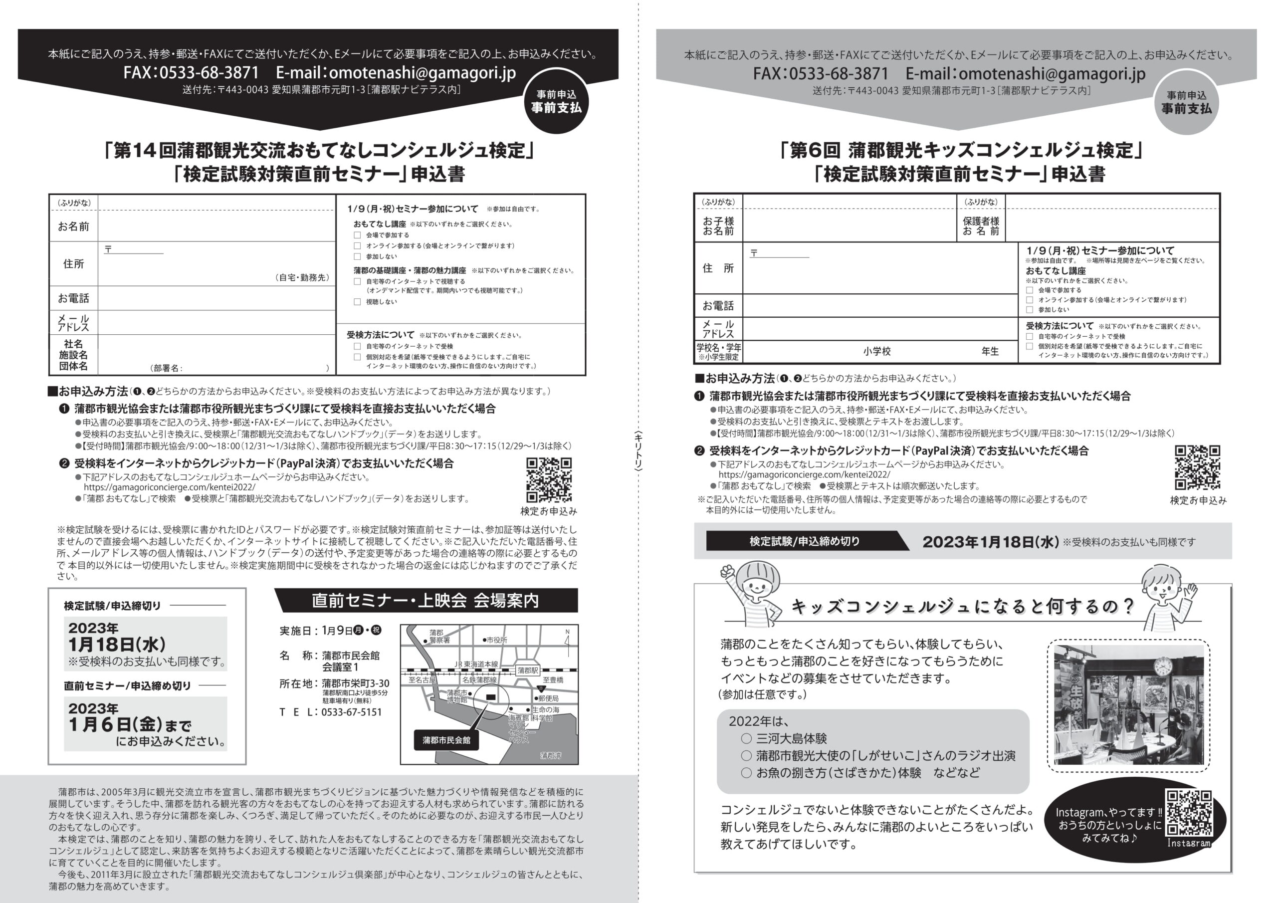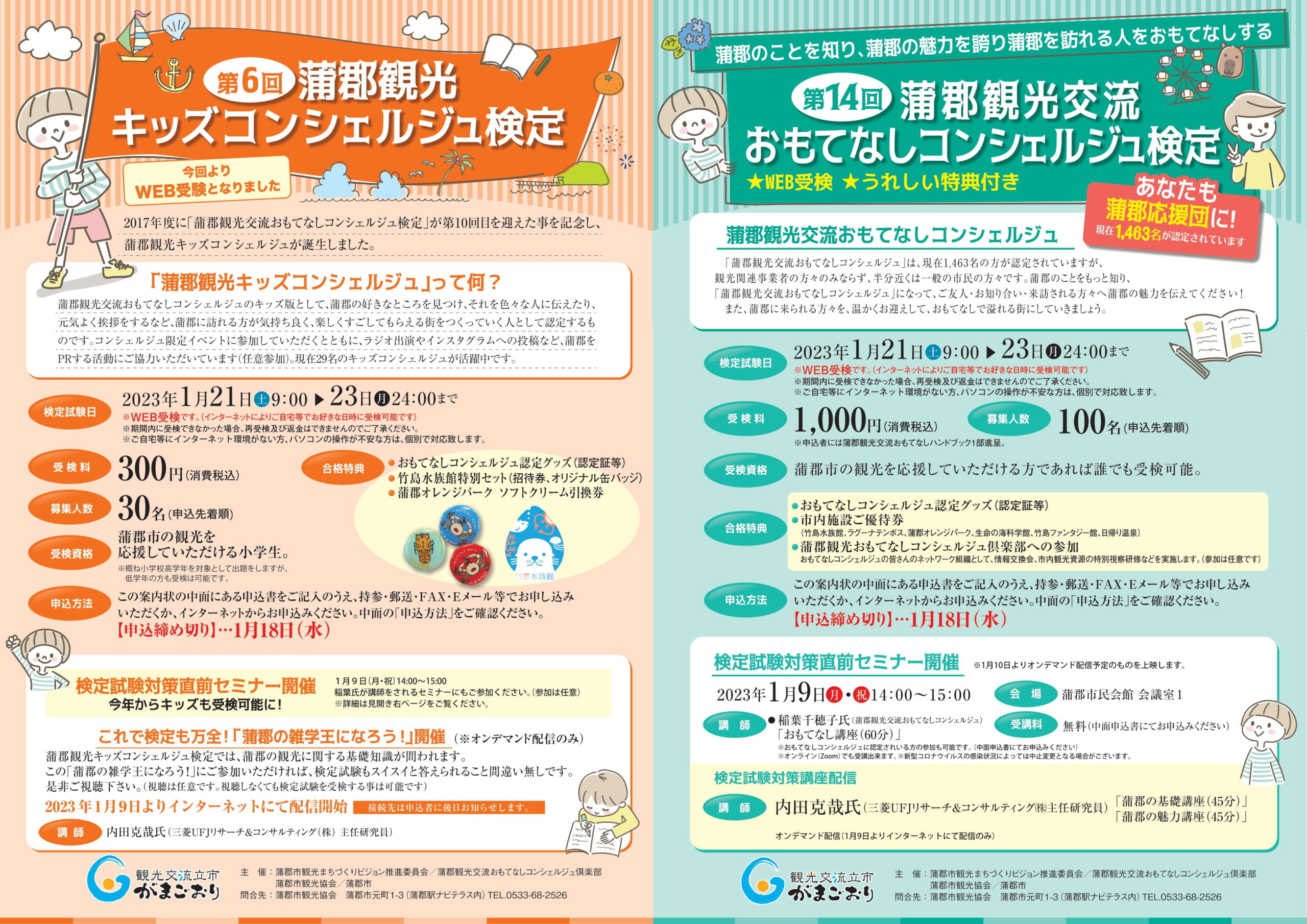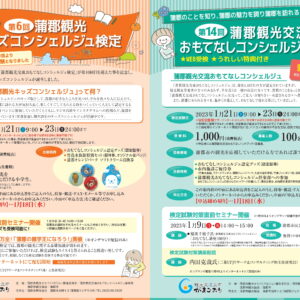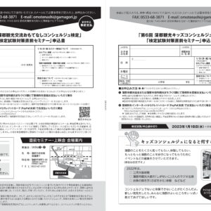 | 受検料 | 第14回蒲郡観光交流おもてなしコンシェルジュ検定:1,000円(消費税込) 第6回蒲郡観光キッズコンシェルジュ検定:300円(消費税込) |