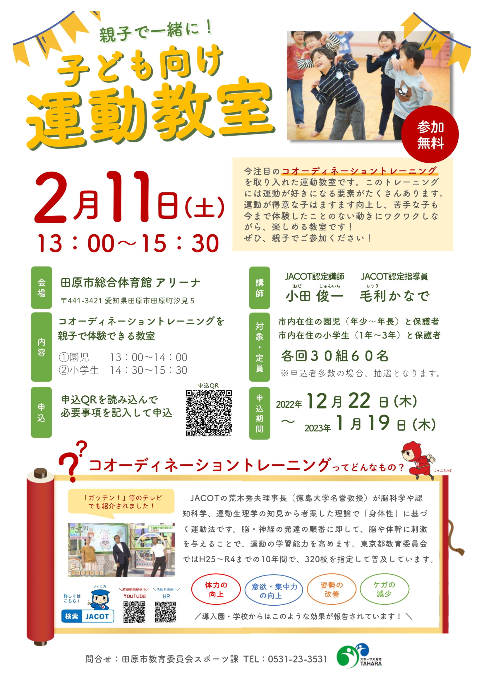 | 対象 | 未就学児、小中学生、一般 (1)園児(年少〜年長)とその保護者 (2)小学生(1〜3年生)とその保護者 ※田原市在住の園児(年少〜年長)・小学生(1〜3年生)とその保護者 |