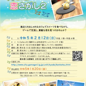 | 日時・場所 | 令和5年2月12日(日) 13:00~16:00 Cafe三代(蒲郡市三谷町若宮95 レストランミヤ2階) |