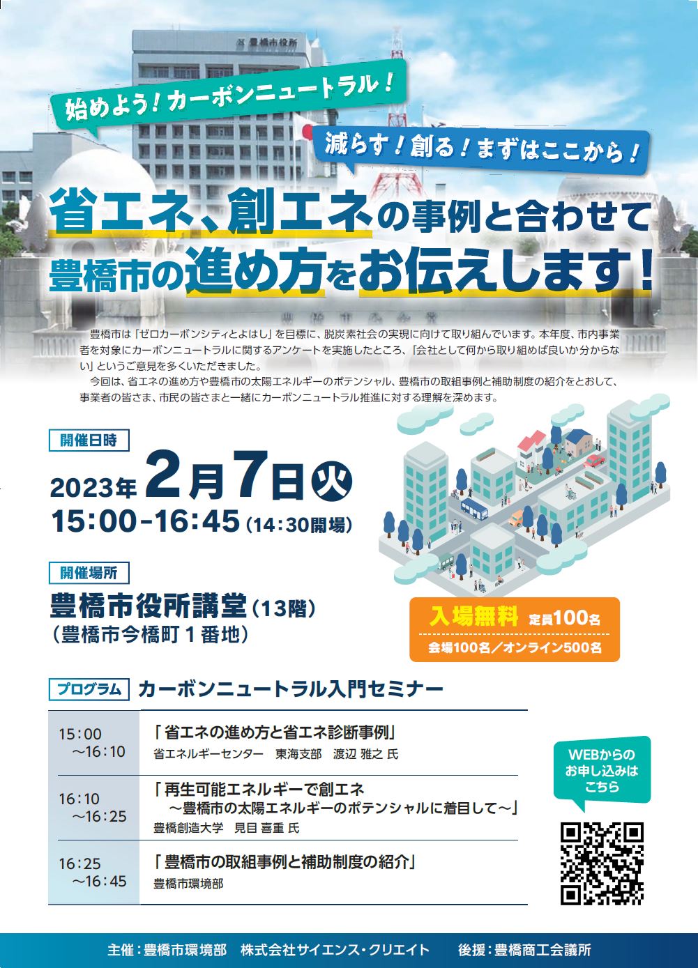 今回は、省エネの進め方や豊橋市の太陽エネルギーのポテンシャル、豊橋市の取組事例と補助制度の紹介をとおして、事業者の皆様、市民の皆さまと一緒にカーボンニュートラル推進に対する理解を深めます。