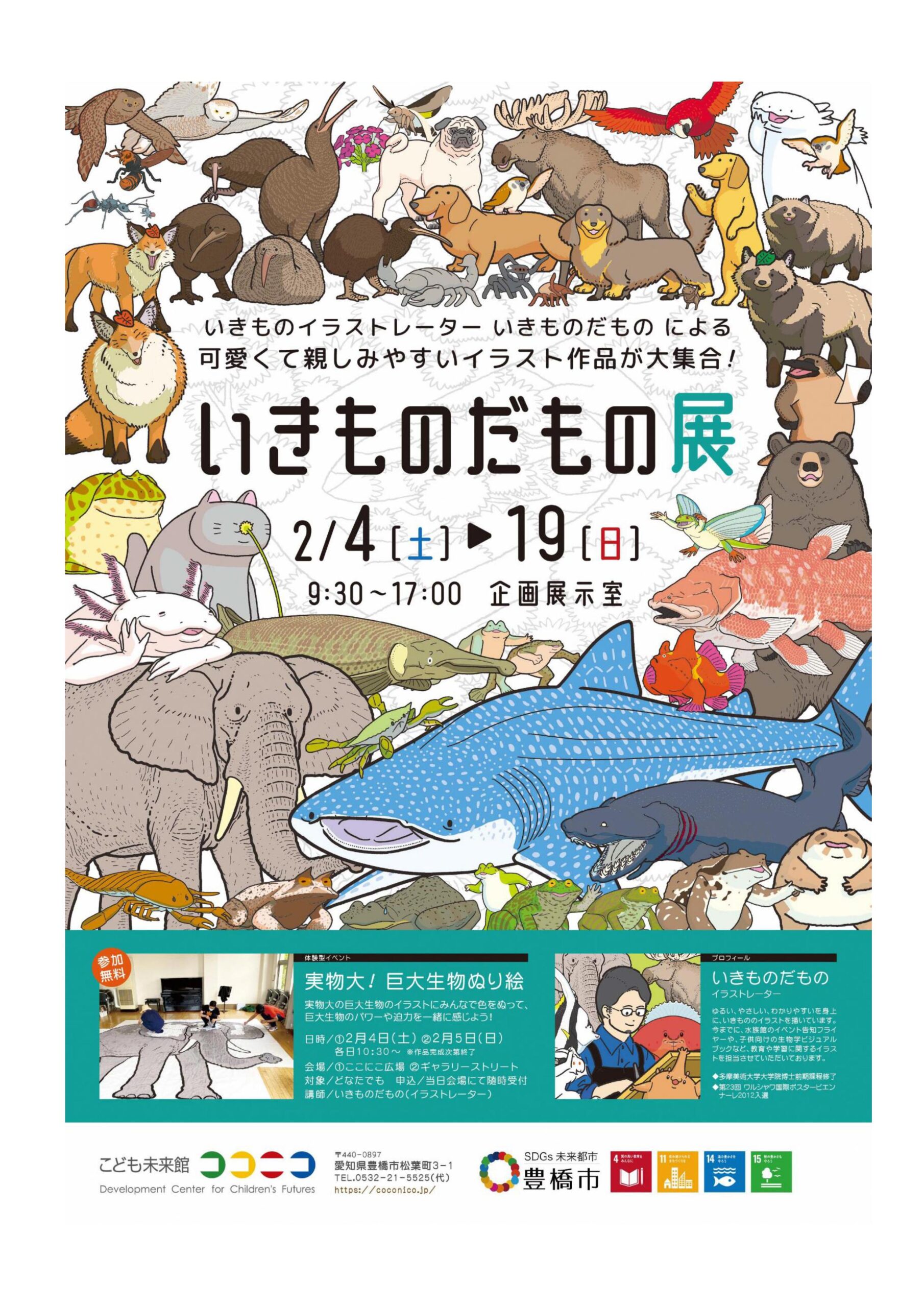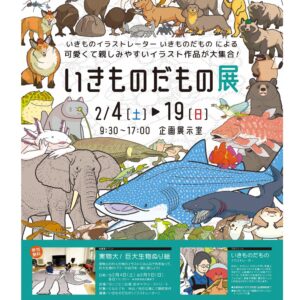あらゆる生き物を描くイラストレーター“いきものだもの”の作品約20点を展示します。