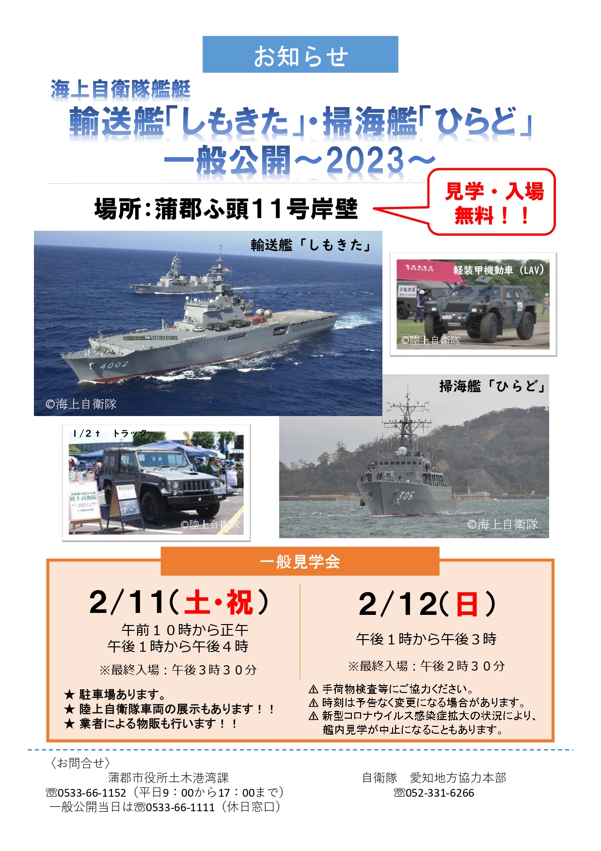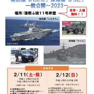 海上自衛隊艦艇の輸送艦「しもきた」・掃海艦「ひらど」が寄港し、艦内見学を行います。