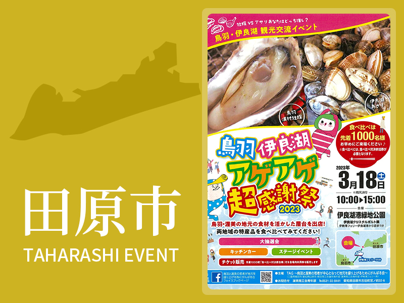 | 主催 | TAG~鳥羽と渥美の若者が地元を盛り上げるためにがんばる会~(三重県鳥羽市・愛知県田原市・鳥羽商工会議所青年部・渥美商工会青年部・伊勢湾フェリー) |