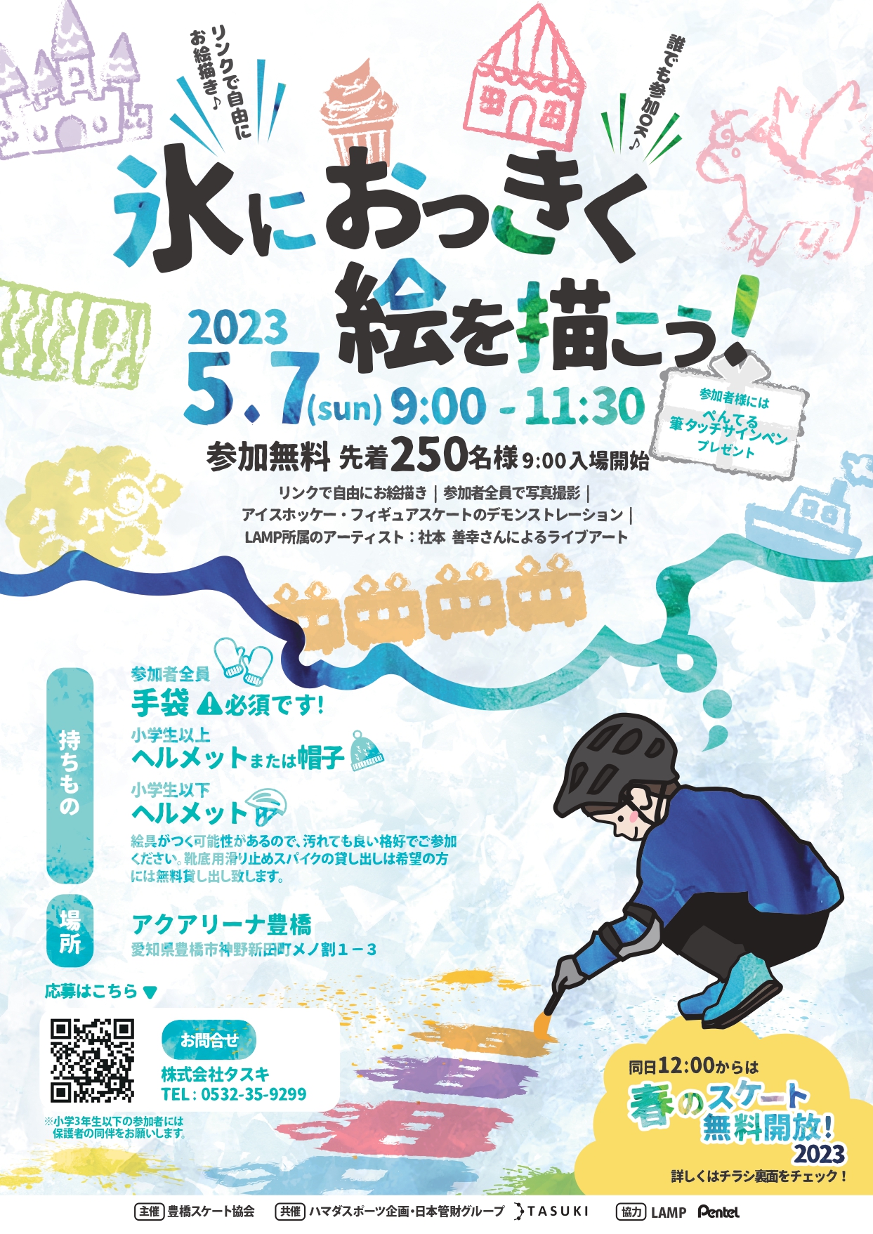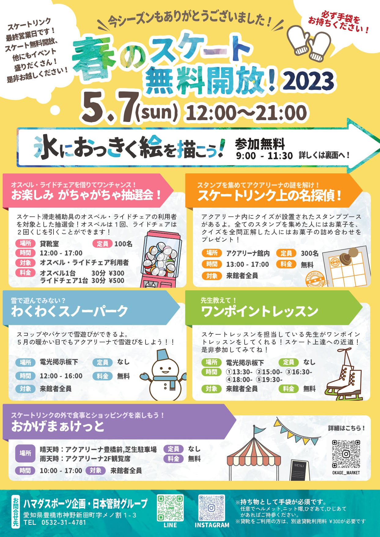 | お問い合わせ | ■氷におっきく絵を描こう 株式会社タスキ:0532-35-9299 ■春のスケート無料開放2023 ハマダスポーツ企画・日本管財グループ:0532-31-4781 |