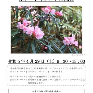 愛知県民の森を歩いて、旧鳳来町の花「ホソバシャクナゲ」を観察します。ゆっくりコースと山のぼりコースの二手に別れます。