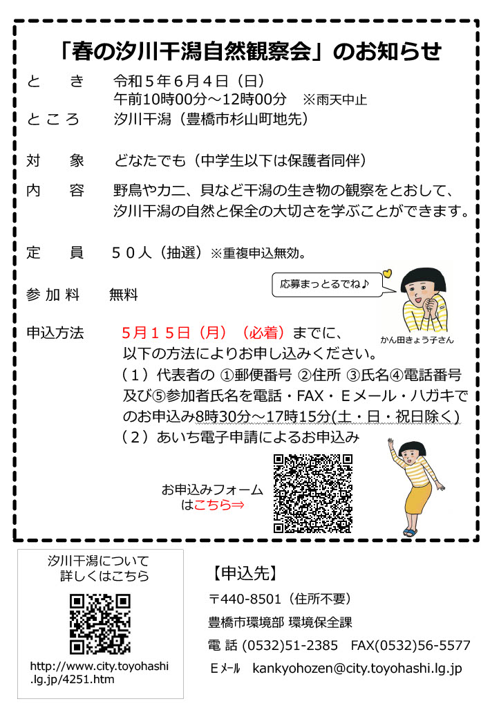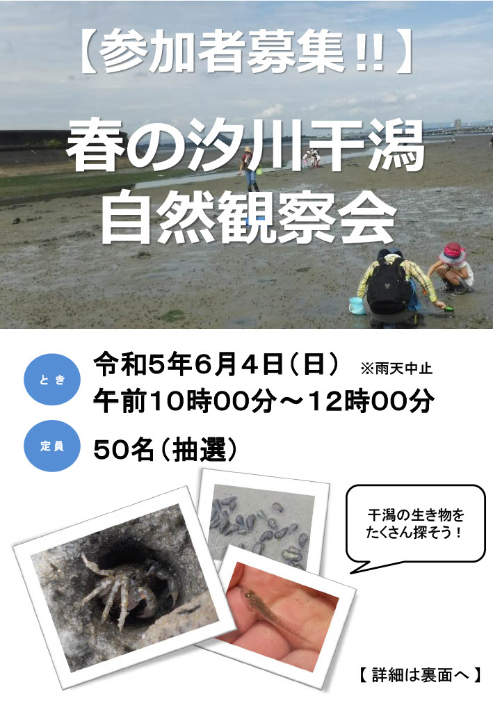 豊橋市と田原市にまたがる汐川干潟は、数多くの渡り鳥や貝、カニなどいろいろな生き物が共存しており、多くの方々に、この生き物の宝庫である汐川干潟の自然について学んでいただき、郷土の自然とその保全の大切さについて考えてもらうために、自然観察会を開催します。