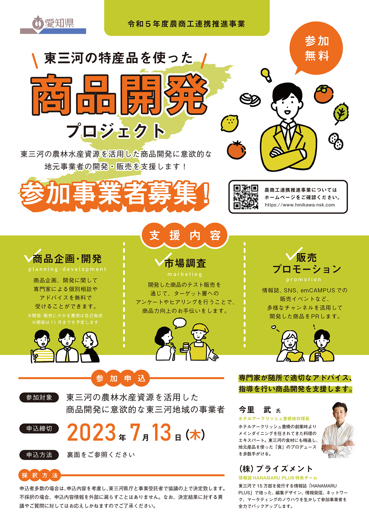 ホテルアークリッシュ豊橋にて総料理長を務める食のプロ、今里 武と東三河の情報誌「HANAMARU PLUS」を発行する広告のプロ、株式会社プライズメントが「商品企画・開発」「市場調査(マーケティング)」「販売プロモーション」の面からみなさまの商品開発を支援します。(※選考あり)また、事前の事業説明会も開催しますので、興味のある方は説明会へ是非ご参加ください。