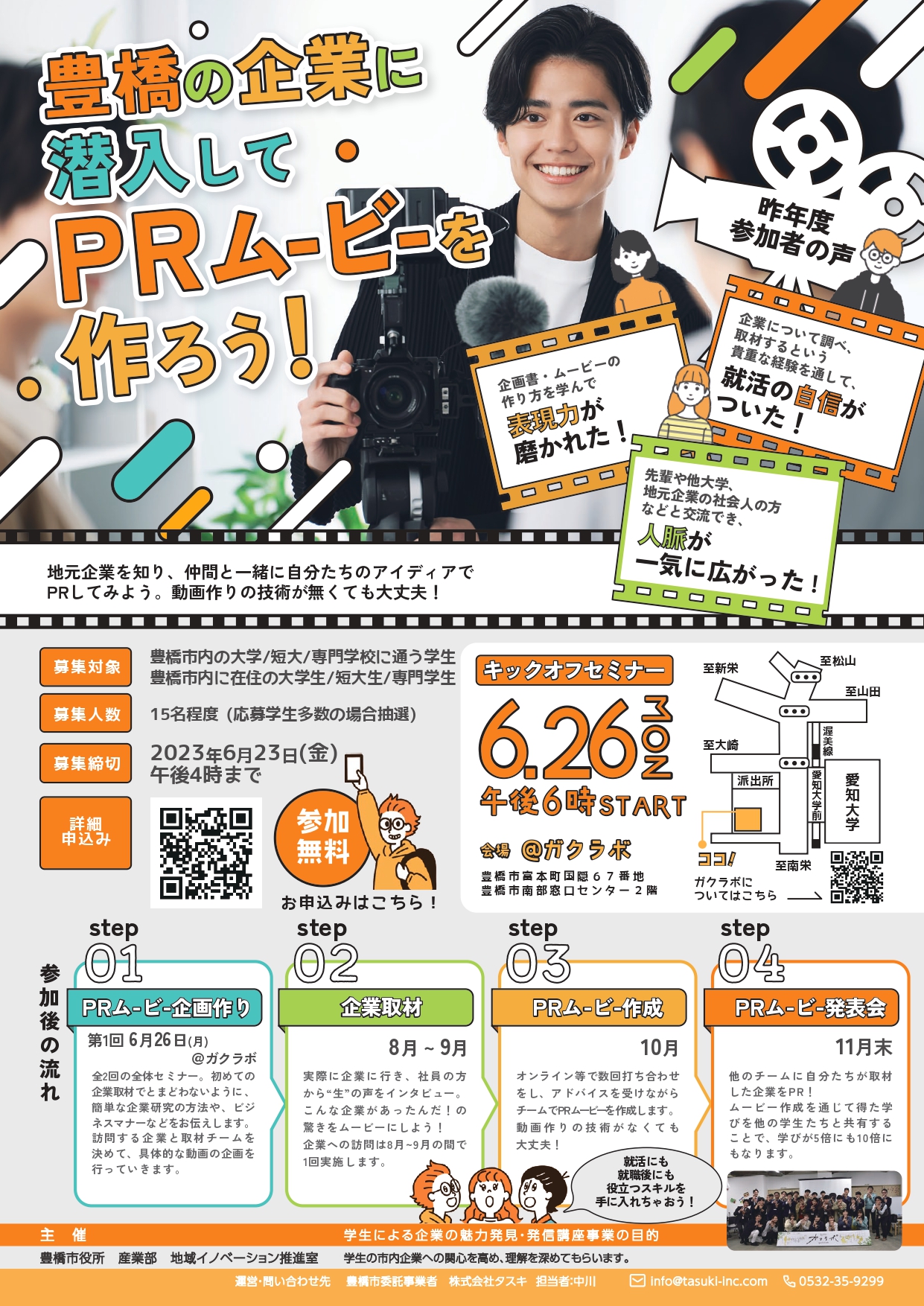 豊橋市内の大学・短大・専門学校に通う学生、豊橋市内在住の大学生・短大生・専門学生の皆さん!豊橋の企業に潜入してPRムービーを作りませんか?