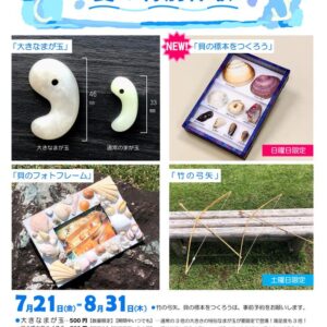 貝の標本をつくろう、竹の弓矢は事前予約が必要です。※数量限定