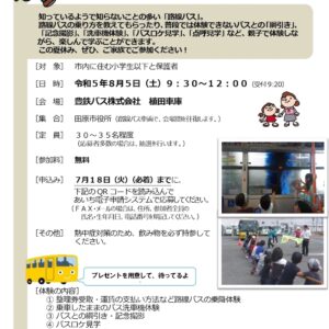 知っているようで知らないことの多い「路線バス」。路線バスの乗り方を教えてもらったり、普段では体験できないバスとの「 綱引き」 「記念撮影」「洗車機体験」「バスロケ見学」「点呼見学」など、親子で体験しな がら楽しんで学ぶことができます。