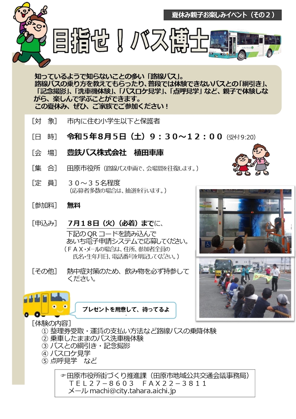 知っているようで知らないことの多い「路線バス」。路線バスの乗り方を教えてもらったり、普段では体験できないバスとの「 綱引き」 「記念撮影」「洗車機体験」「バスロケ見学」「点呼見学」など、親子で体験しな がら楽しんで学ぶことができます。