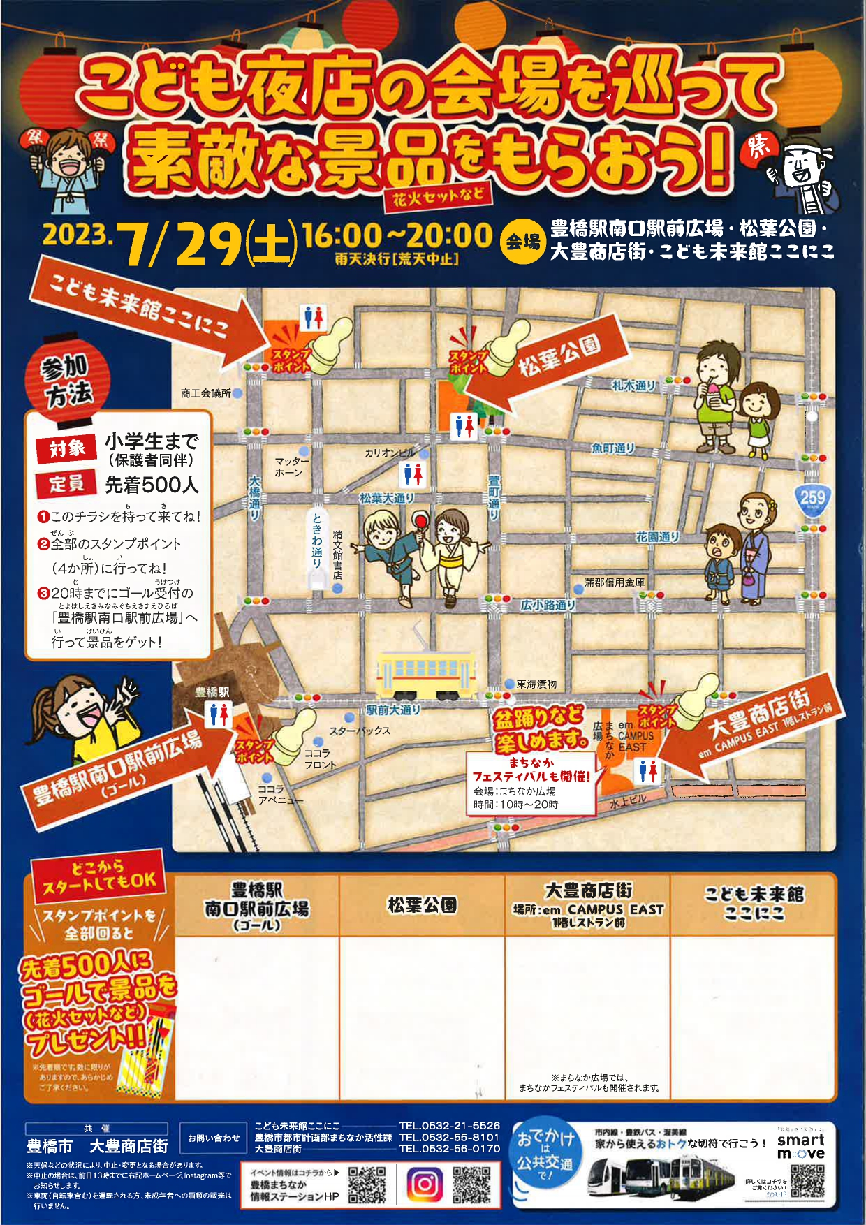 | お問い合わせ | こども未来館ここにこ TEL0532-21-5526 豊橋市都市計画部まちなか活性課 TEL0532-55-8101 大豊商店街 TEL0532-56-0170 |