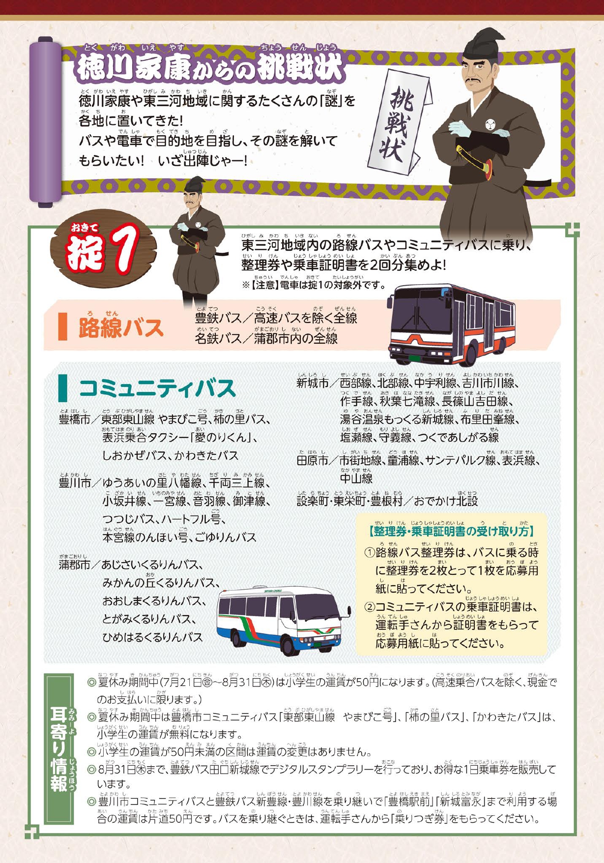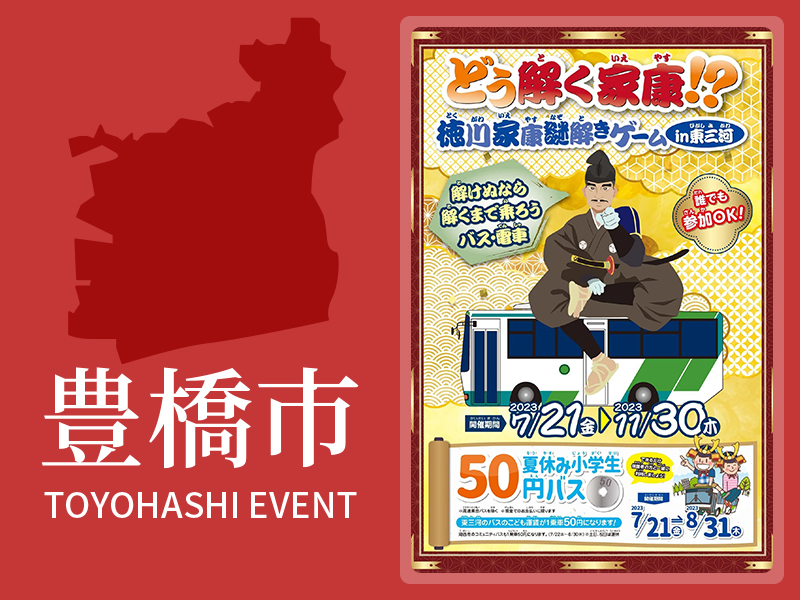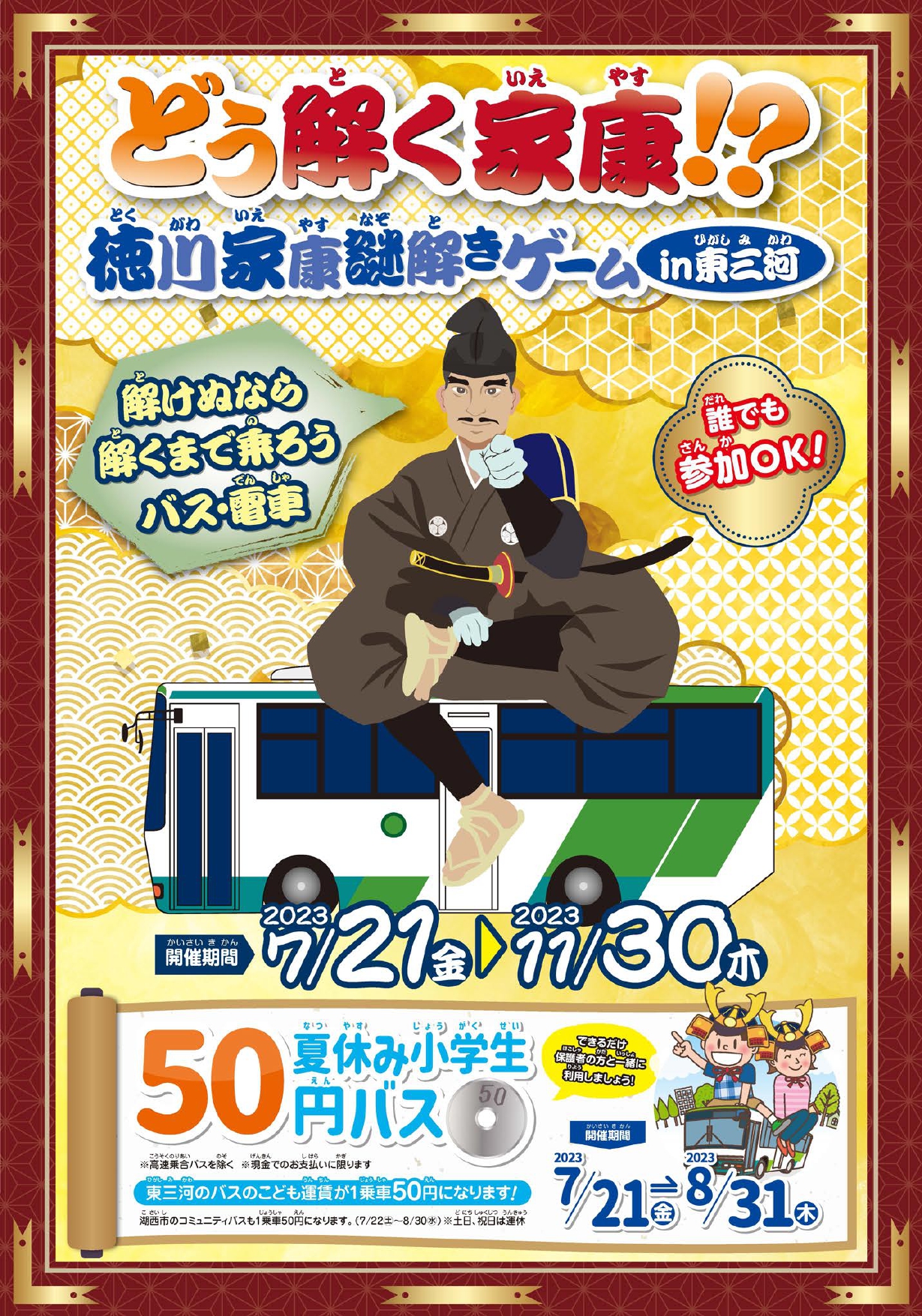 | 開催期間 | 夏休み小学生50円バス:令和5年7月21日(金)~8月31日(木) どう解く家康!?徳川家康謎解きゲームin東三河:令和5年7月21日(金)~11月30日(木) |