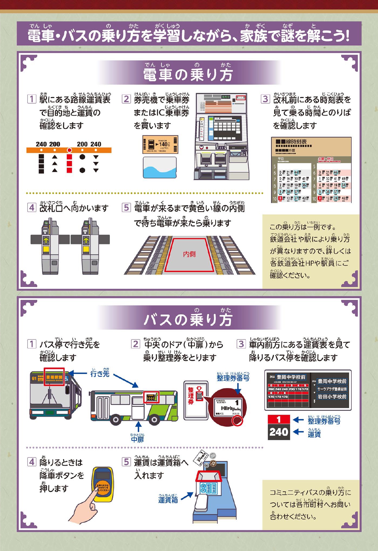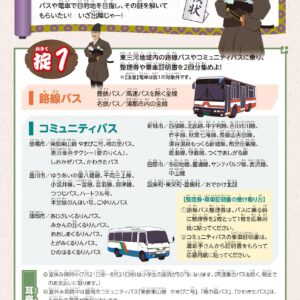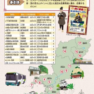 ○参加方法:パンフレットの「応募用紙」にバスの整理券またはコミュニティバスの乗車証明書を貼り付け、謎の答えなどの必要事項を記入して郵送または持参