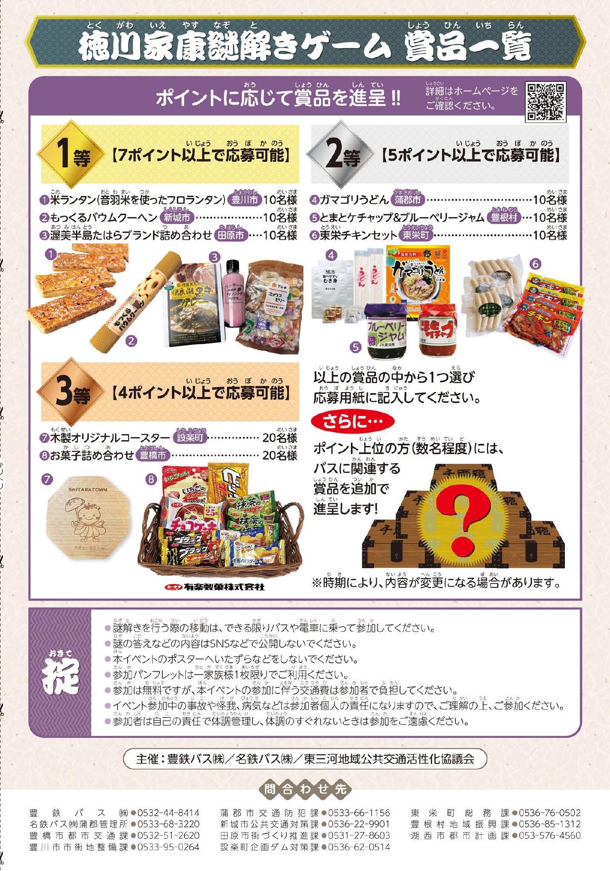 また、期間中には「どう解く家康!?徳川家康謎解きゲームin東三河」を併せて開催しますので、この夏は積極的に公共交通を利用して夏休みの思い出を作りましょう!抽選で東三河の特産品が当たります!