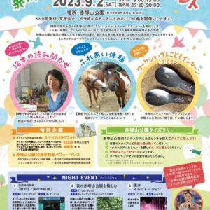 昼の部は、新たなふれあい体験として、ポニー(ミライとカケル)とその日限定の馬に乗ることができる乗馬体験や平尾小学校と八南小学校の生徒が赤塚山公園と協同で採集した白川の生き物を「ミニ水族館」として特別展示します。また、豊川市出身の絵本作家かべやふようさんによる絵本の読み聞かせやトークショー、あかつかテラスや水の広場周辺では、当日限定のキッチンカーなどの飲食ブースやワークショップの出店があります。
