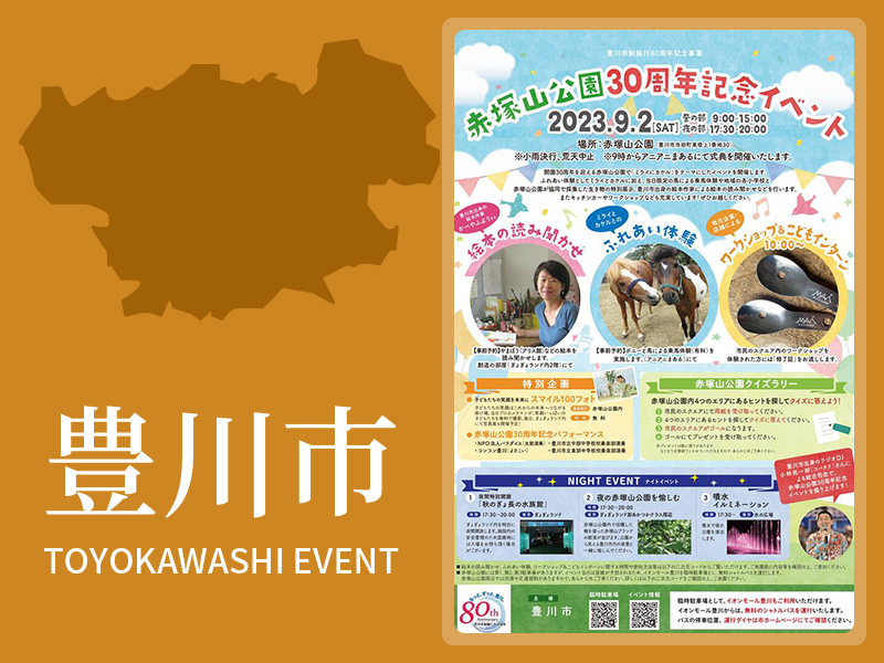 豊川市制施行80周年記念事業として、開園30周年を迎える赤塚山公園で、「ミライにカケル」をテーマに各種イベントを開催します。