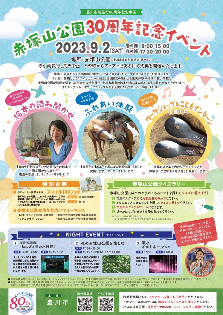 豊川市制施行80周年記念事業として、開園30周年を迎える赤塚山公園で、「ミライにカケル」をテーマに各種イベントを開催します。