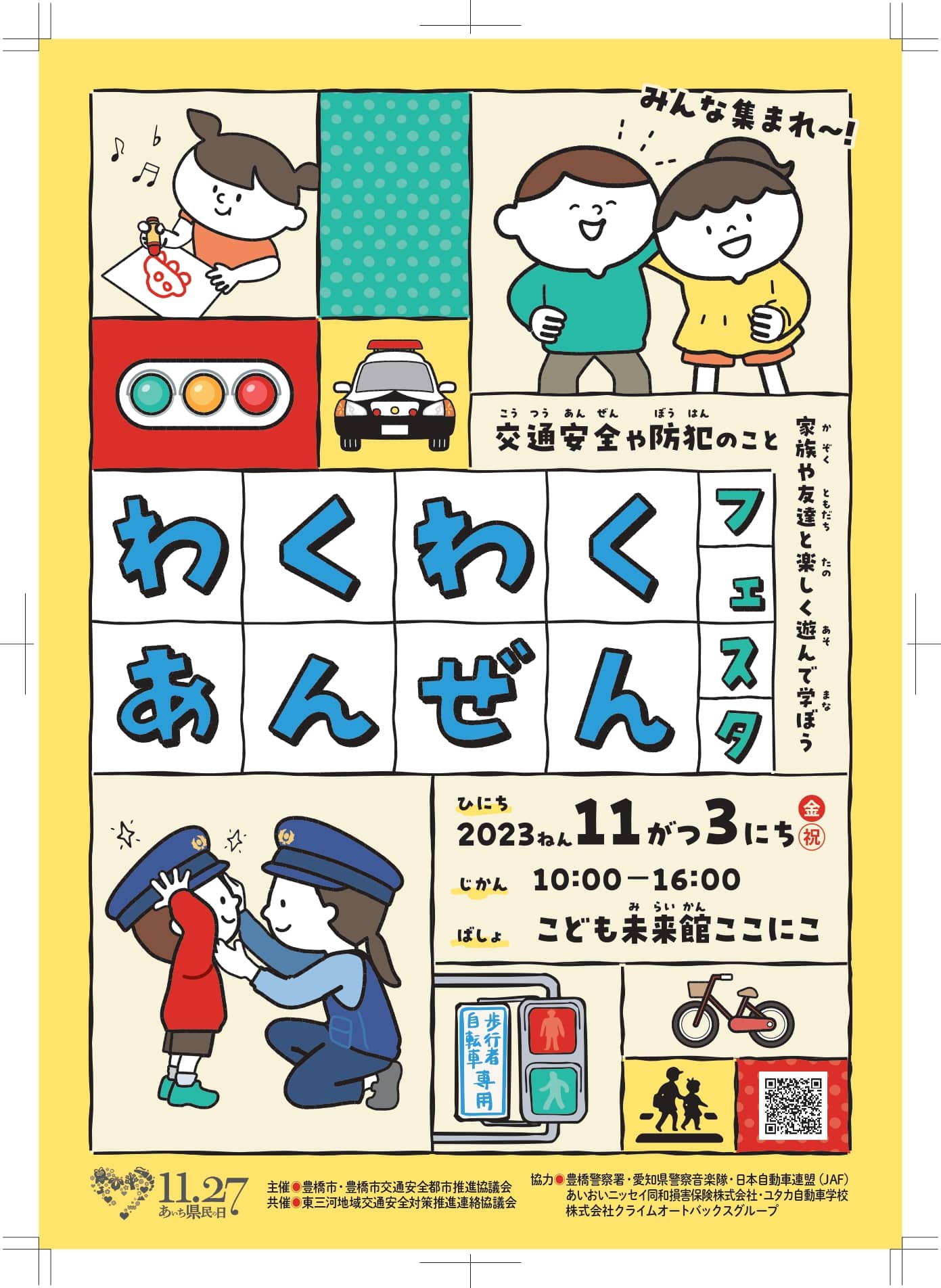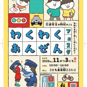 子どもたちや家族が安全・安心に生活できるよう、「交通安全・防犯」の大切さについて親子で学ぶことができるイベントを、こども未来館「ここにこ」で開催します。