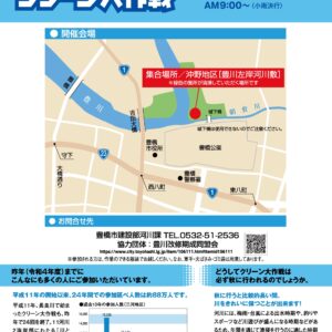 2023年10月29日「川と海のクリーン大作戦」を開催いたします。川と海のクリーン大作戦は平成11年に長良川で始まり、現在11河川2海岸部にわたり開催されています。豊川では平成14年から実施し、今年で22回目です。参加費無料です。
