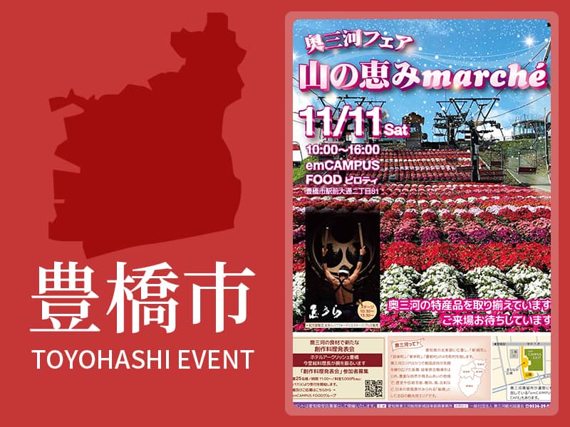 奥三河地域の特産品や体験が集まる「奥三河フェア山の恵みmarché(マルシェ)」がemCAMPUS(エムキャンパス) FOOD(フード) にて開催されます。