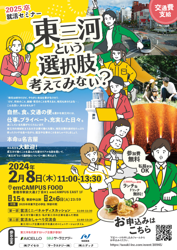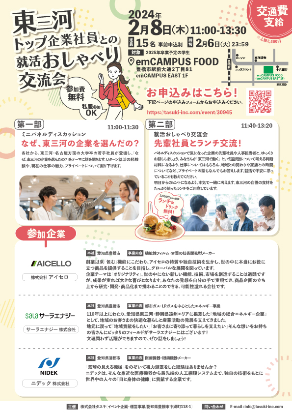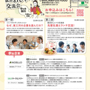 東三河の地域を支える大手企業で働く先輩と、地元自慢の食材をたっぷり使ったランチを食べながら、就活や仕事のことをおしゃべりしましょう。